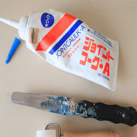 ジョイントコークという接着剤をよく使います。剥がれの部分に塗り、上からしっかり押さえてよく乾かします。ヘラのような長くてしなやかな道具を使うと作業がしやすいです。接着剤も厚塗り禁物。多少のはみ出しは乾く前にボロ布でさっと拭き取ればOK。